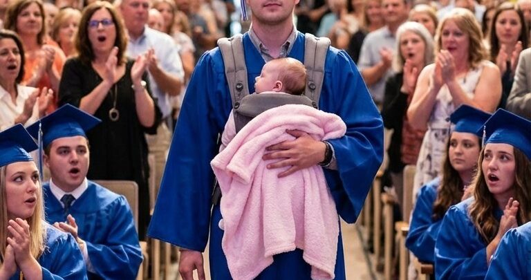 My instincts took over. I reached into the carrier and placed the tiny, sleeping infant into his arms. He tucked her securely against his chest, her small face barely visible beneath the heavy fabric of his graduation gown, wrapped in a soft pink blanket. He turned and began the long walk toward the stage. The reaction was instantaneous. The air in the room curdled as whispers turned into ripples of mocking laughter. “Are you serious?” someone muttered. “How typical,” another snickered. Then, directly behind me, a woman hissed a sentence that felt like a physical blow: “Just like his mother.”
